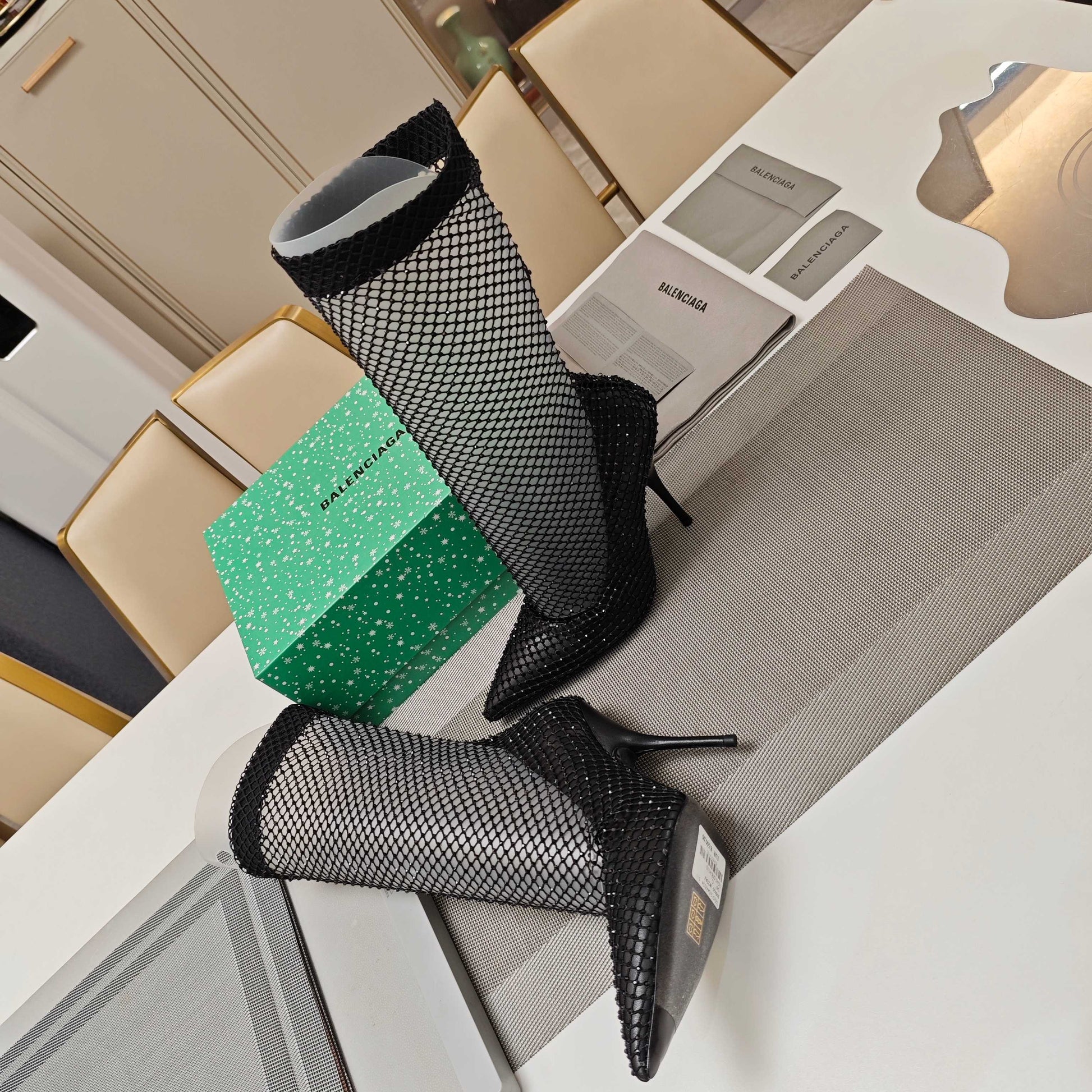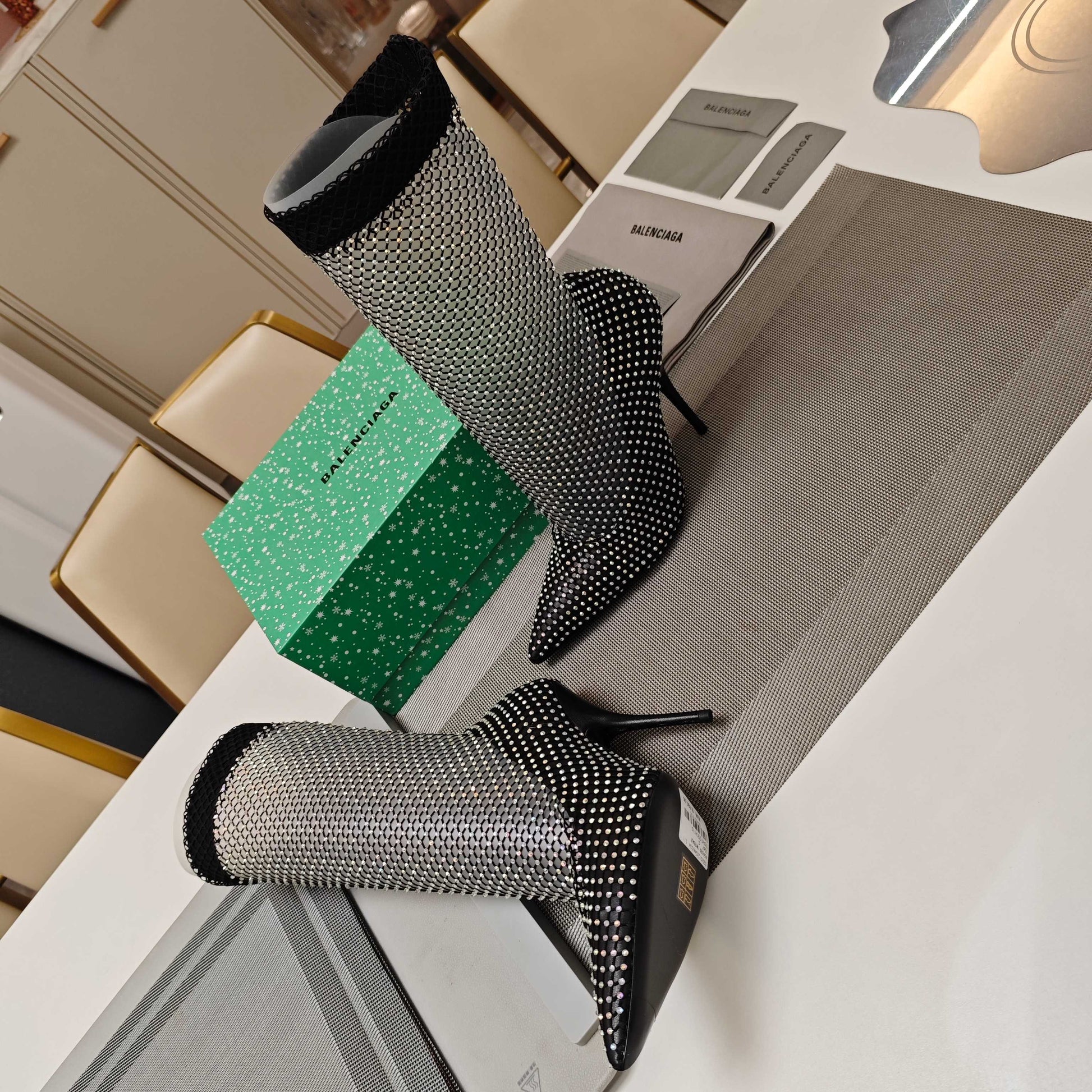 Step into elegance with our Radiant Avenue Bootie, crafted from luxurious Nappa lambskin and delicately adorned with shimmering rhinestone fishnet. This exquisite pair offers a seamless blend of sophistication and comfort, perfect for elevating your everyday ensemble. Let your stride tell a story of grace and style with every step.