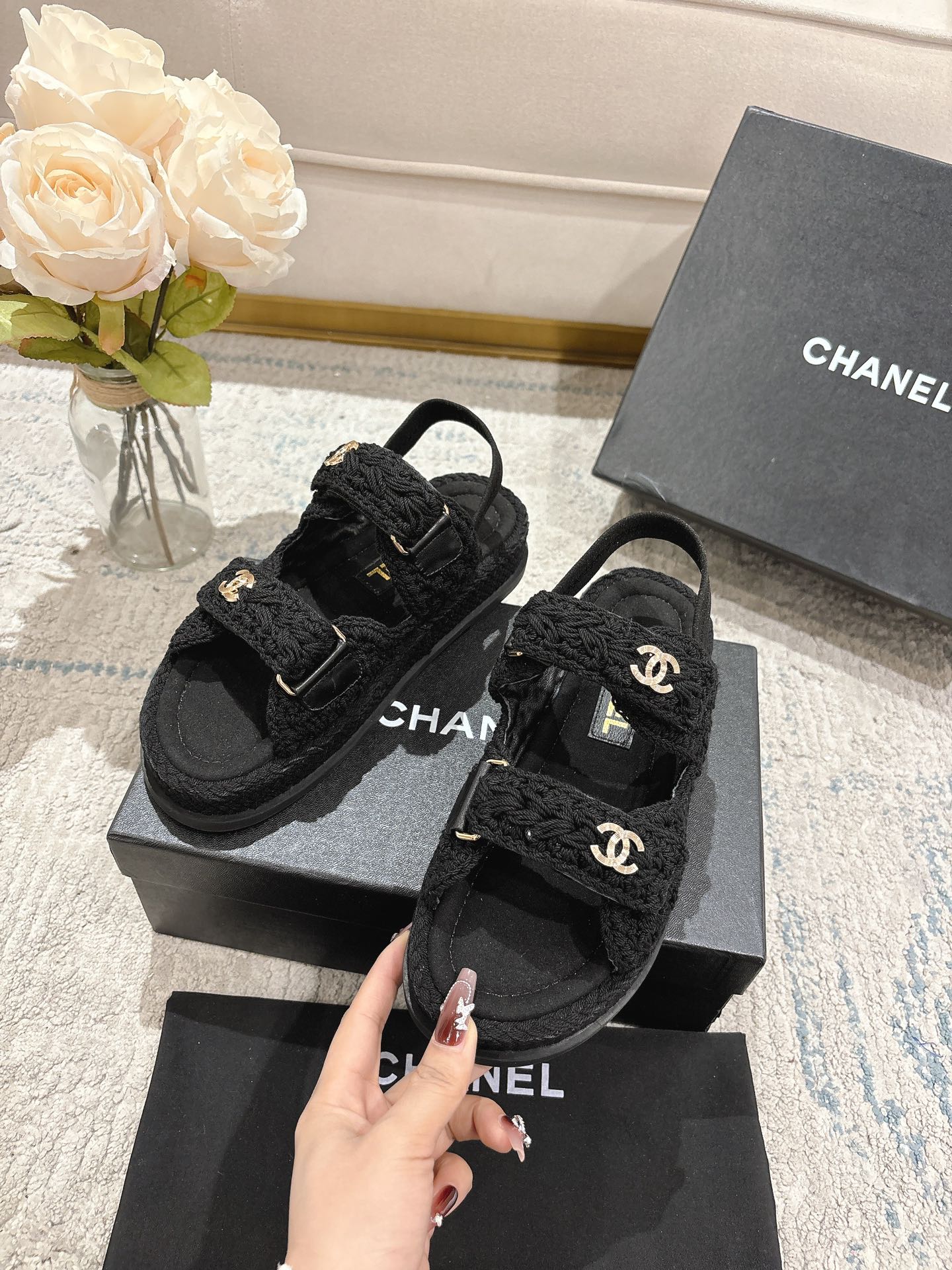 Step into a realm of effortless elegance with these exquisite Chanel sandals. Crafted from rich knit fabric, they promise a perfect blend of comfort and refined style for your everyday adventures. Ideal for the discerning individual who values both fashion and function.