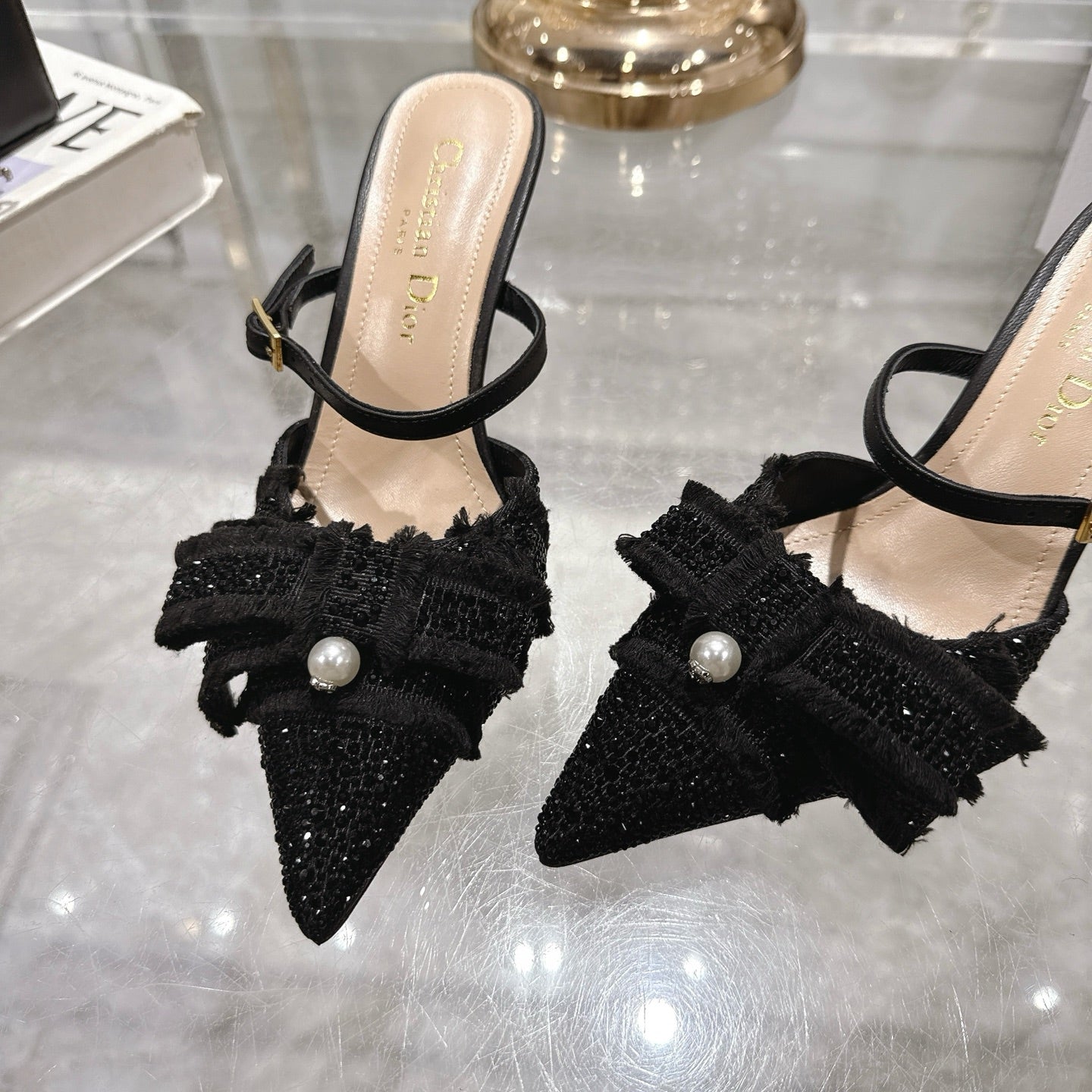 The Adiorable Slingback Pump offers a modern, elegant take on classic Dior style. Crafted in black fringed grosgrain, it features a deconstructed bow adorned with a white resin pearl and the signature “CD” detail. Designed with a pointed toe and adjustable buckled strap, it rests on an 8 cm heel for refined elevation. Finished with a leather sole engraved with Dior’s lucky star and a goatskin lining, it brings couture sophistication to any look.