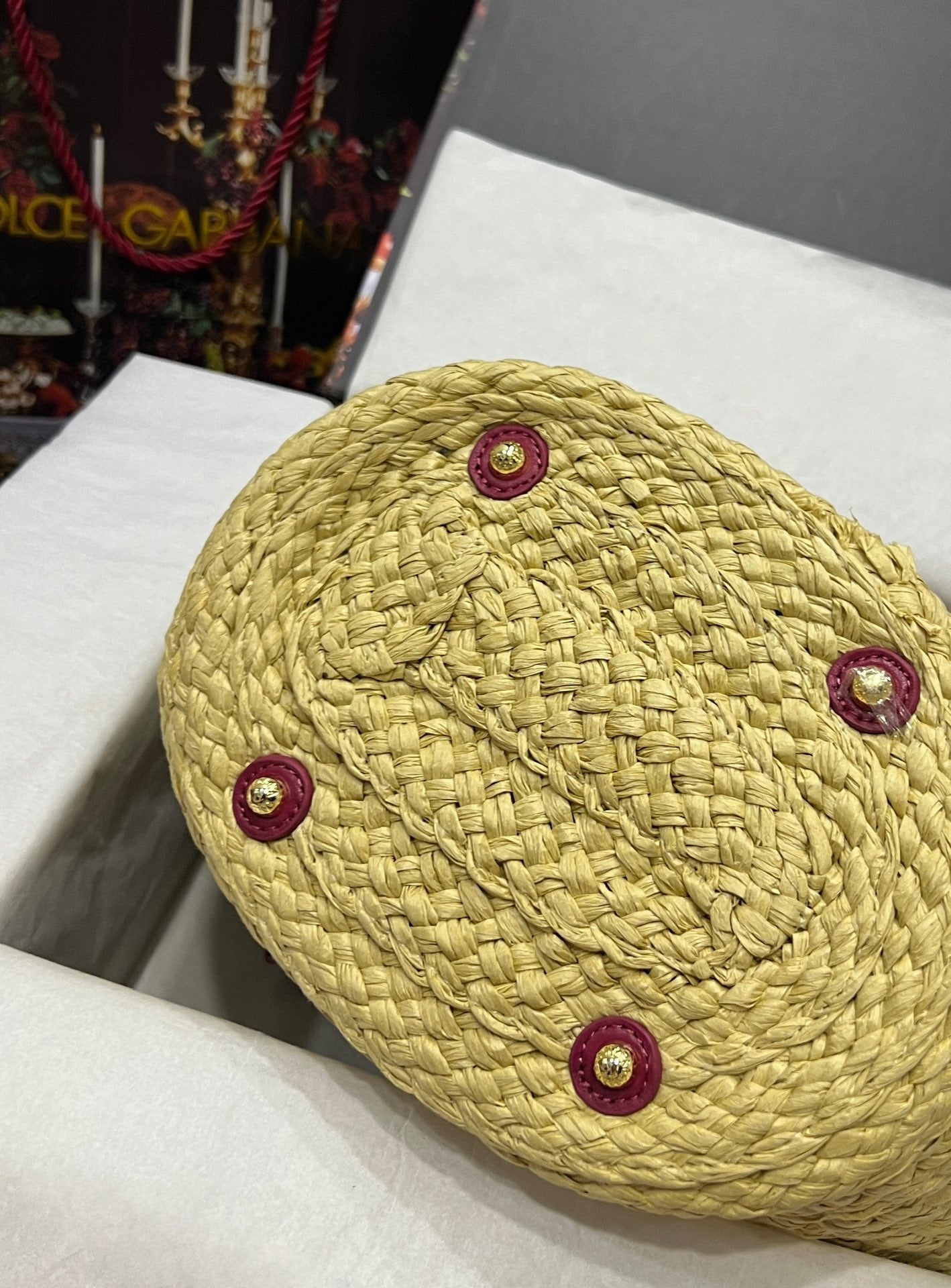 The Dolce & Gabbana Kendra tote bag is a beautifully crafted straw shopper inspired by Sicilian majolica ceramics. It typically features a woven raffia or corn-fiber body, accented with a bold DG calfskin logo on the front and silk‑twill scarves wrapped around the handles.
