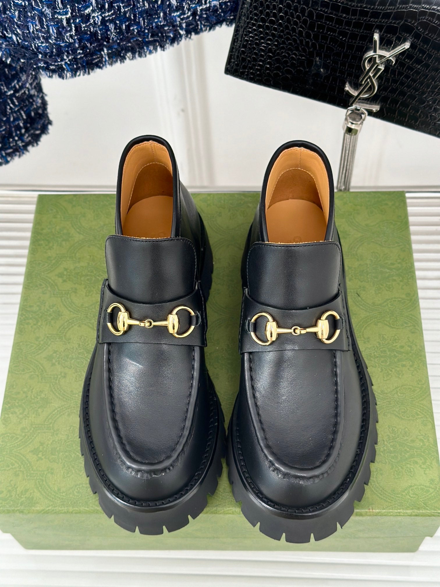 Blending the rugged appeal of boots with the ease of moccasins, this black leather loafer is set on a lightweight rubber lug sole for enhanced comfort and durability. Its refined silhouette is accented by Gucci’s iconic Horsebit detail, bringing a polished finish to this versatile everyday shoe.