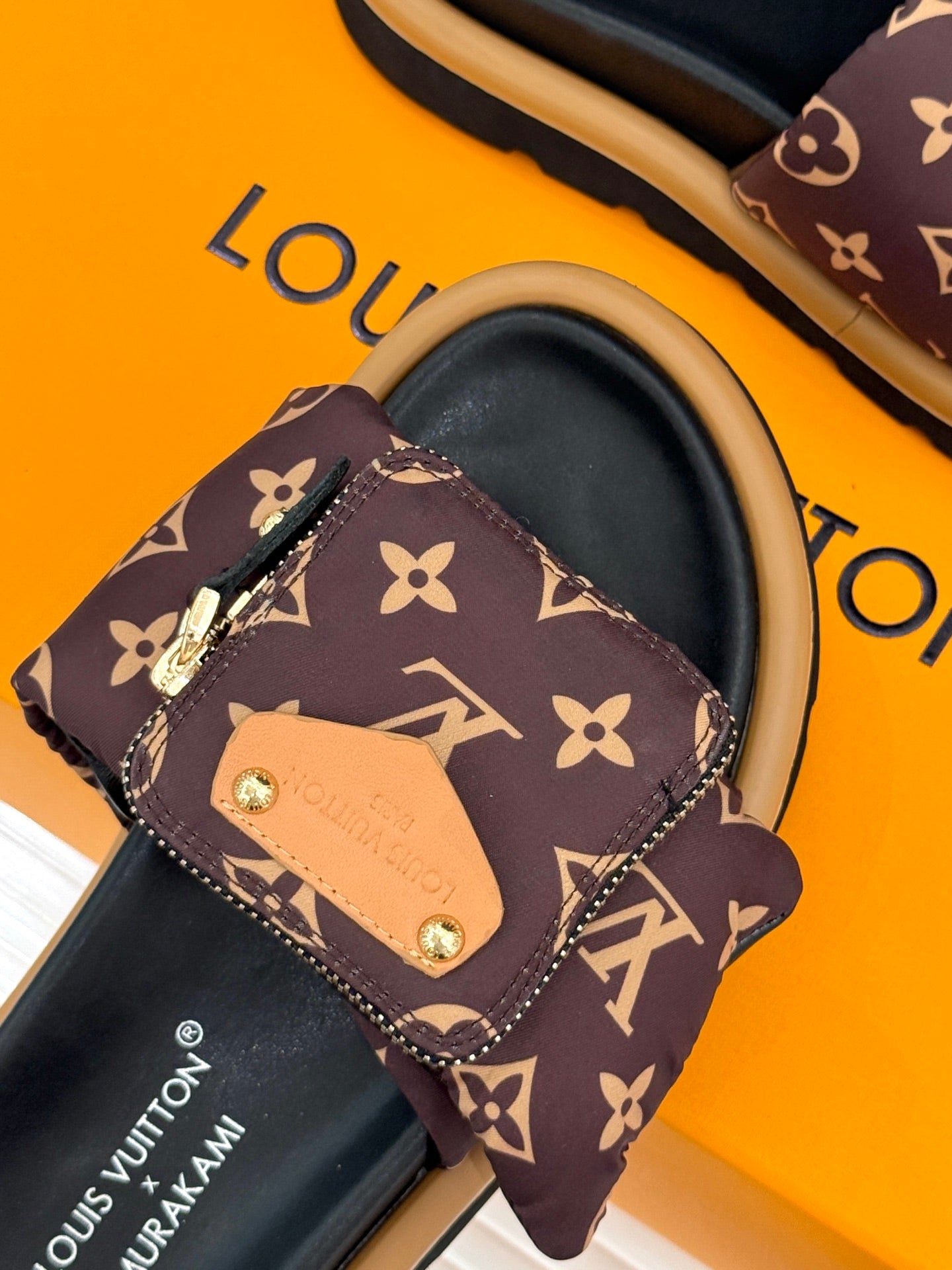 Make heads turn with these monogram LV-style slides featuring a unique mini pouch design. Inspired by the Takashi Murakami x Louis Vuitton collection, these slippers are perfect for women who love chic and bold fashion. Slip into comfort with these designer-inspired sandals made for everyday glam.