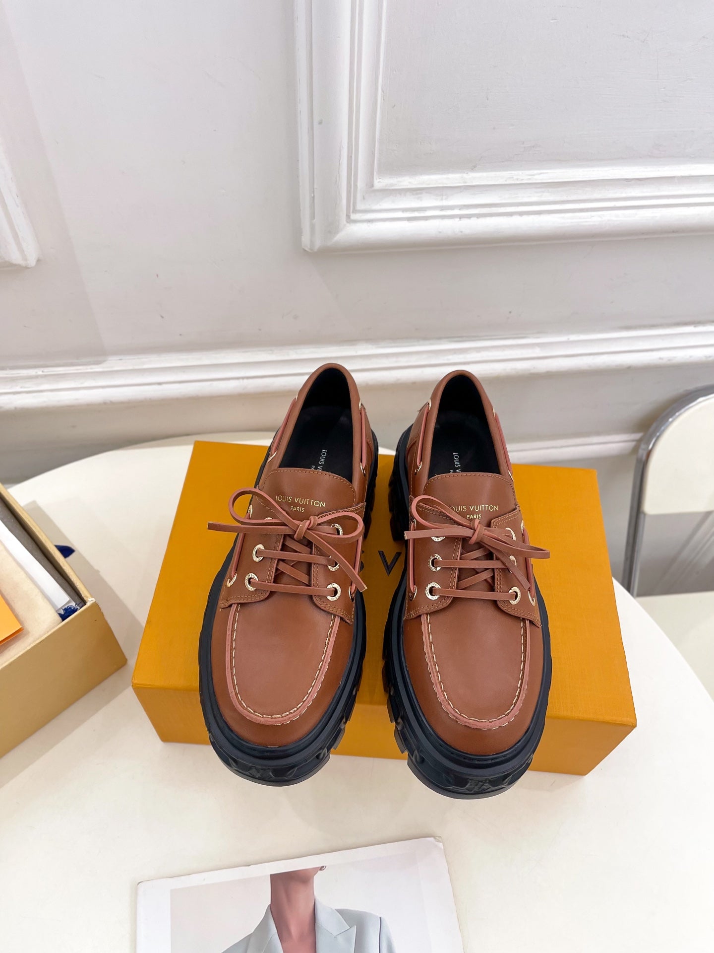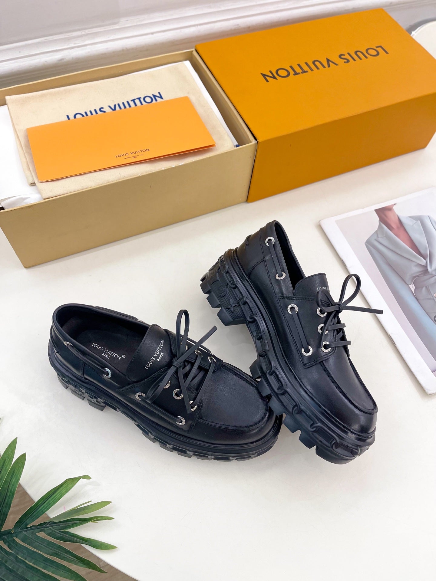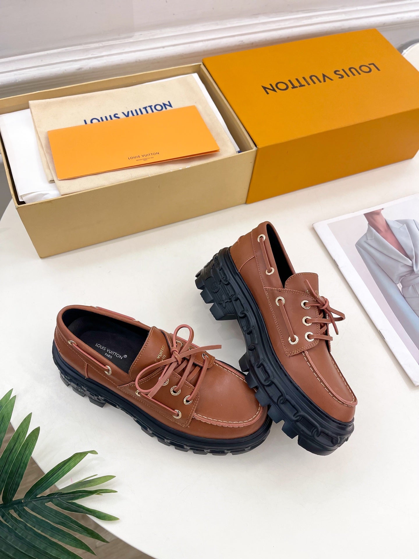 The LV Record boat shoe comes in smooth calf leather with authentic details such as leather laces, which are threaded through engraved, gold-toned eyelets. A key feature of this model is its chunky outsole in lightweight EVA rubber.