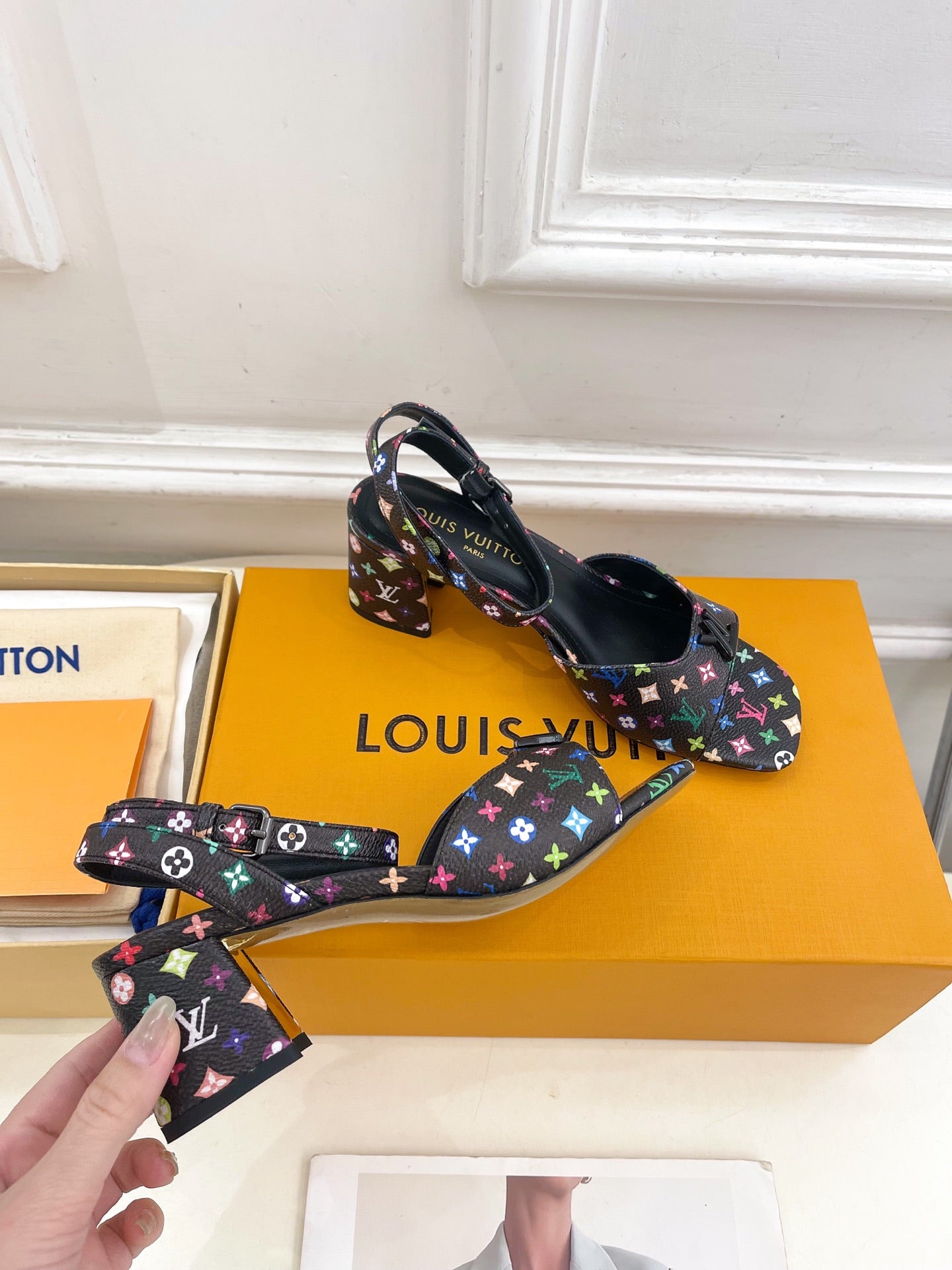 The Shake Sandals showcase a bold, contemporary look crafted from sleek patent calf leather. This standout style features a broad front strap adorned with a matching LV detail, paired with a striking V-shaped block heel. A delicate ankle strap, secured by a small gold-tone buckle, adds a touch of elegance.